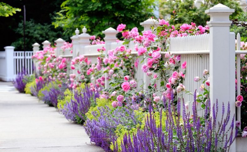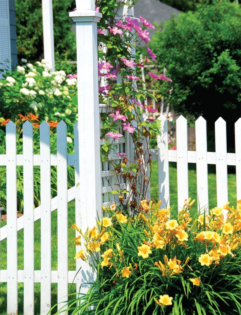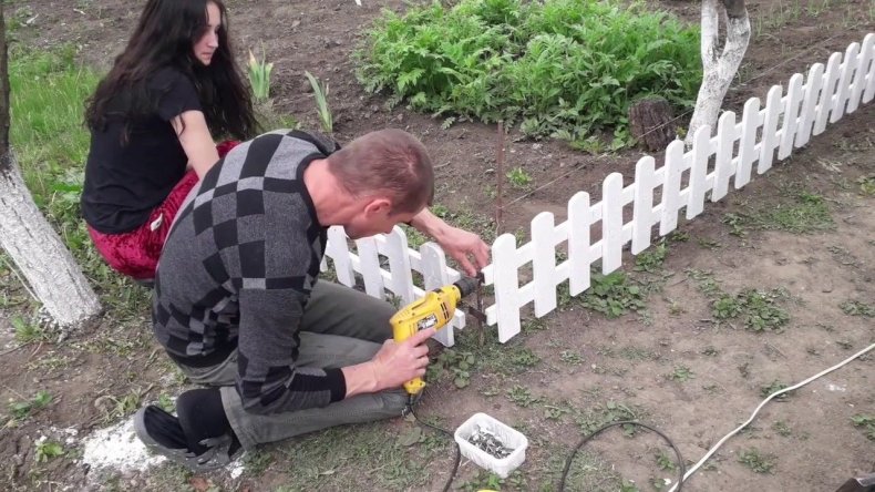 - Заборчик из штакетника собирают из заранее сделанных секций.