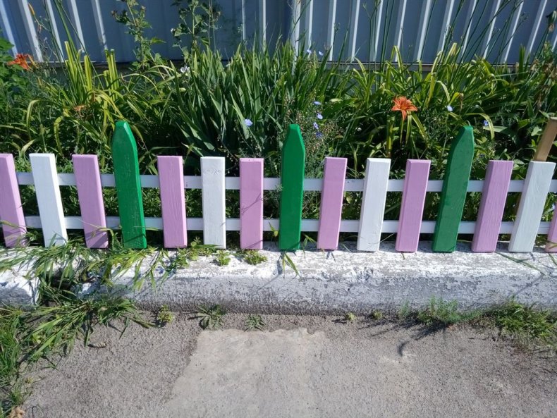 Готовый заборчик оставляют в натуральном виде или красят, чтобы не нарушать общий дизайн. Верх может быть ровным, волнообразным или любой другой конфигурации, например, чередование разных по высоте заготовок через одну.