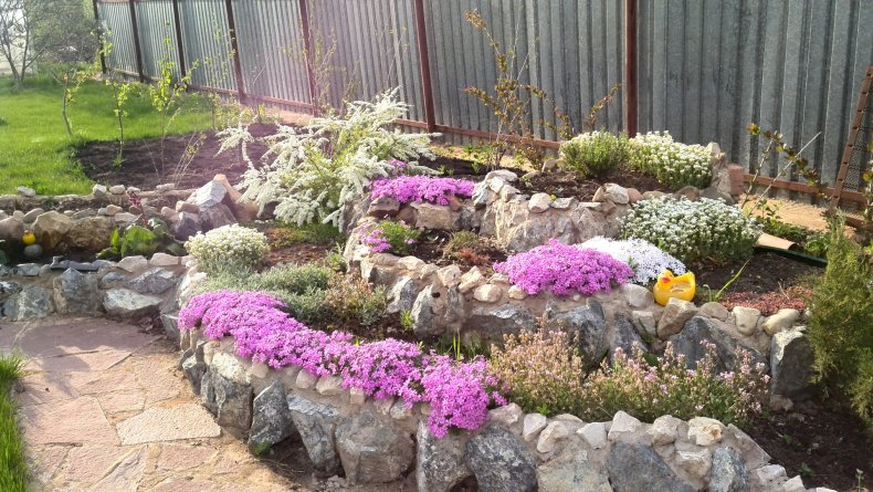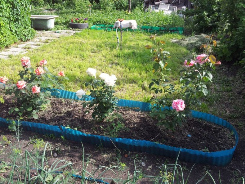 Оставшиеся от стройки куски профнастила, шифера, черепицу используют для ограждений. Эти материалы прочные, эстетично выглядят, долговечны. Профнастил и шифер можно использовать для вертикальных клумб.