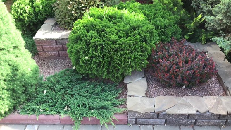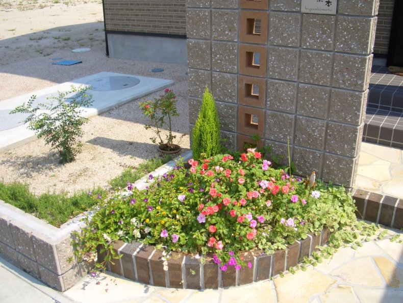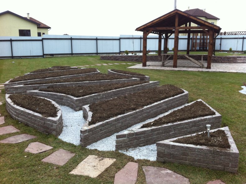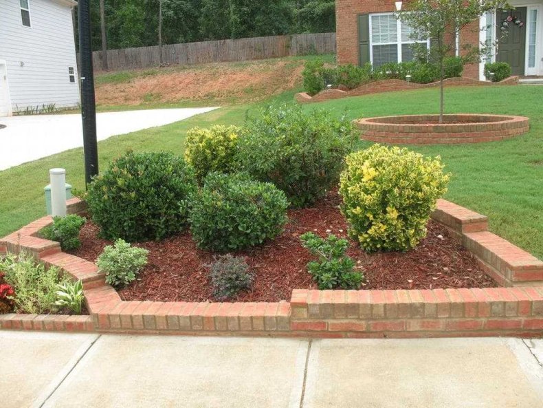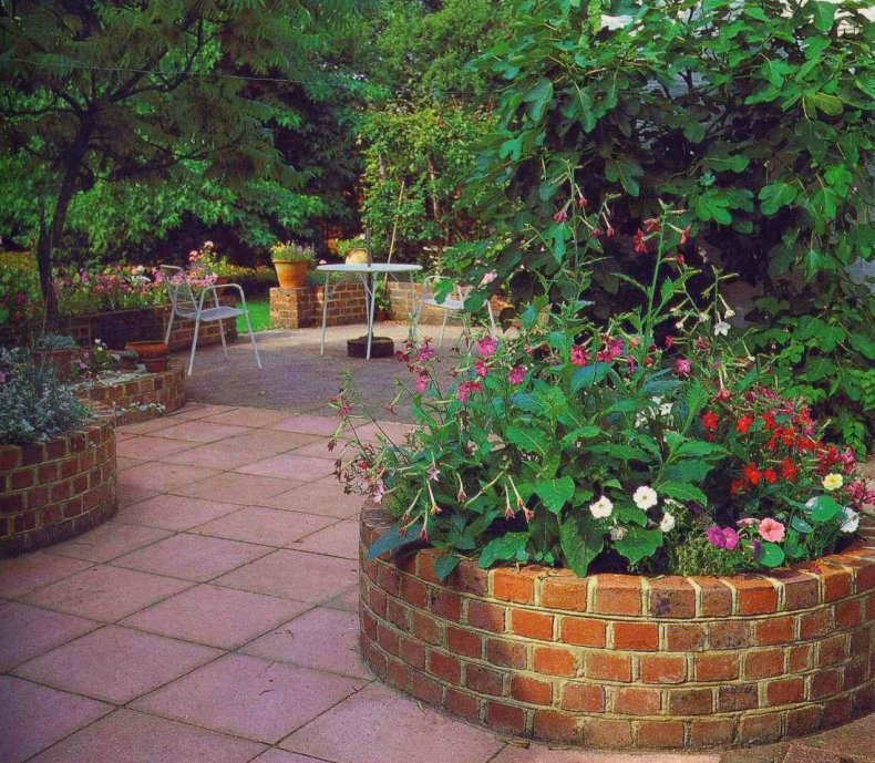 Кирпич удобен для работы. Из него легко создавать ограждения разной конфигурации. Если нет уверенности, что растения будут постоянно на этом месте, лучше укладывать кирпич без цемента. Такие сооружения не должны быть высокими.