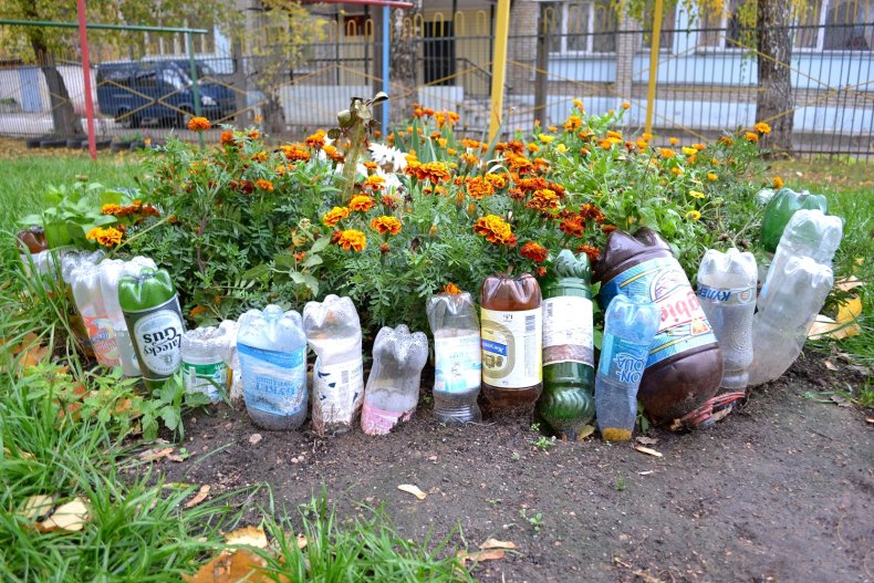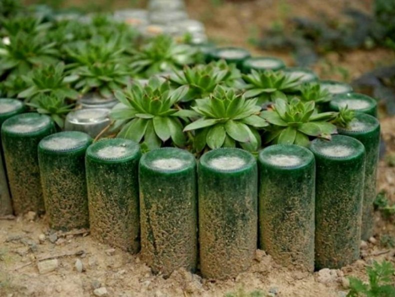 Ими удобно обозначать границы любой формы, плавность линий будет без труда сохранена. В подготовленную канавку расставляют бутылки горлышком вниз, прикапывают, уплотняют землю.