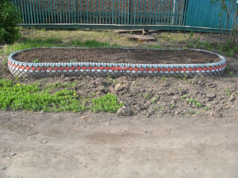 Простой вариант огородить цветник – шины. Их вкапывают по периметру. Делают вертикальные клумбы, используя шины разных диаметров. Вырезают красивые вазоны. Красят специальной краской для резины.