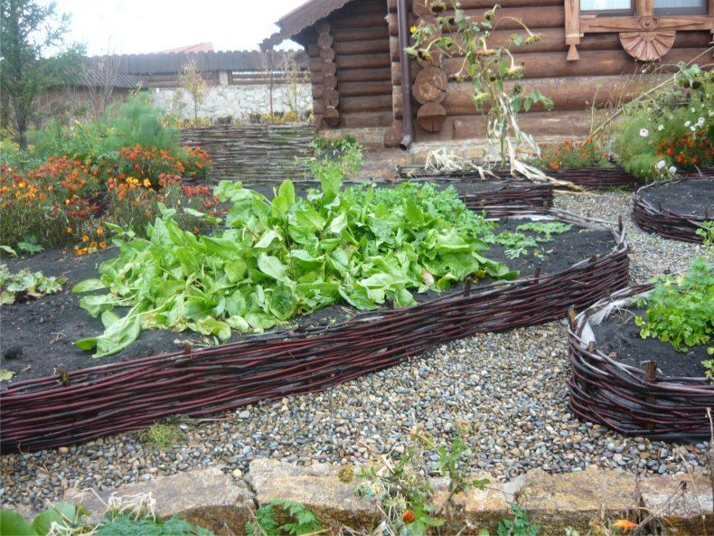 По периметру, через 30-40 см вбивают колышки и оплетают их лозой поочерёдно с лицевой и обратной стороны.