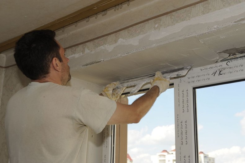 С высохших откосов снимаются направляющие элементы, монтируются малярные уголки.