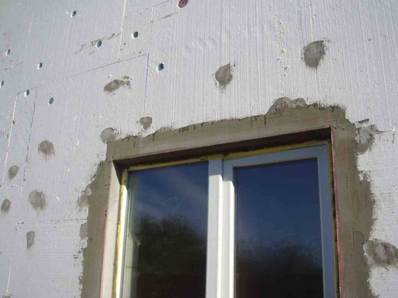 Утеплитель монтируется на грунтованную поверхность. Если откосы широкие – фиксируется специальными креплениями.