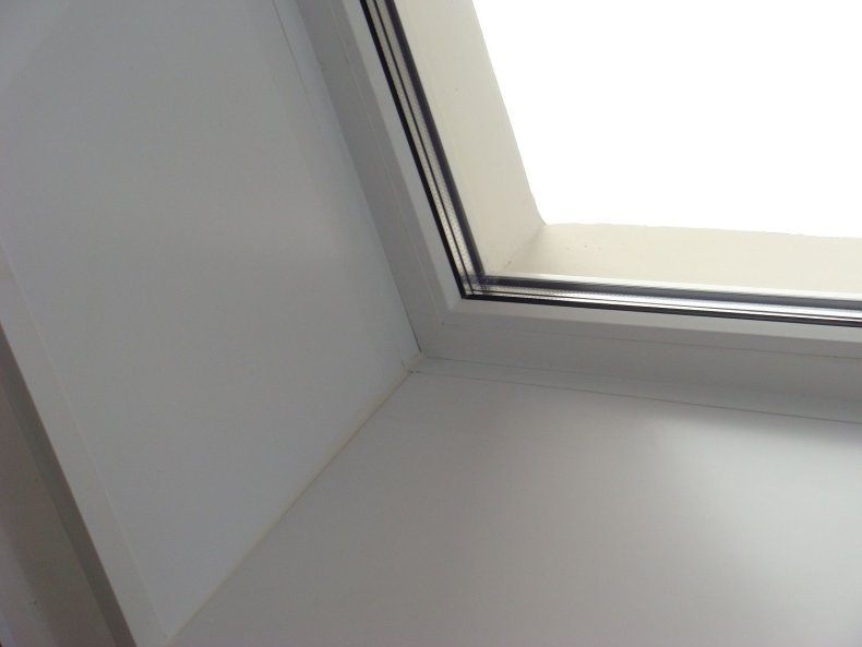 - Пластиковые откосы вырезаются согласно предварительно снятым меркам. После подгонки элементы вставляются в пазы профиля.