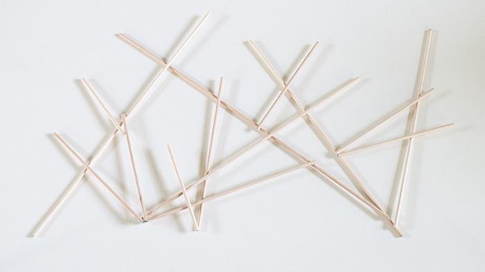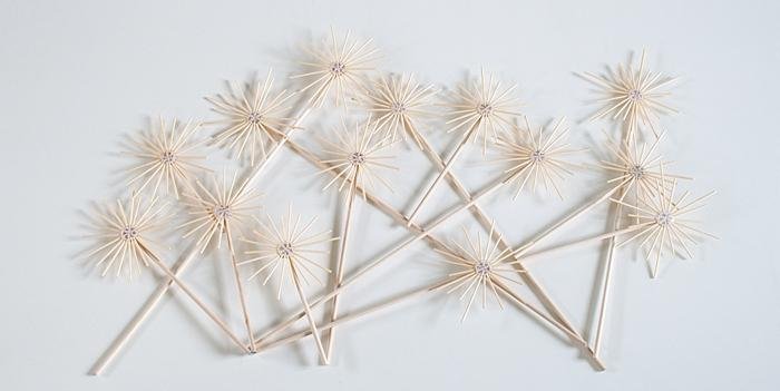 - Сформировать из спагетти стебельки цветов, а из перьев – листочки.