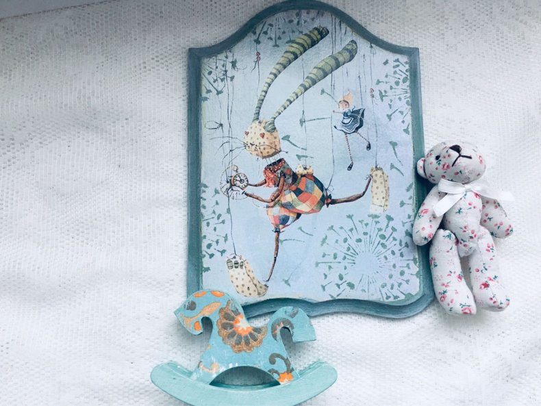 Для детской комнаты можно сделать панно из любых материалов и разного вида, главное – учитывать интересы ребенка. Популярные темы: пожелания хорошего дня и спокойной ночи, изображение любимых героев.