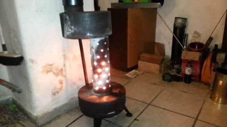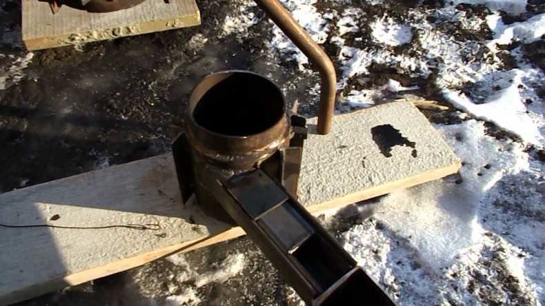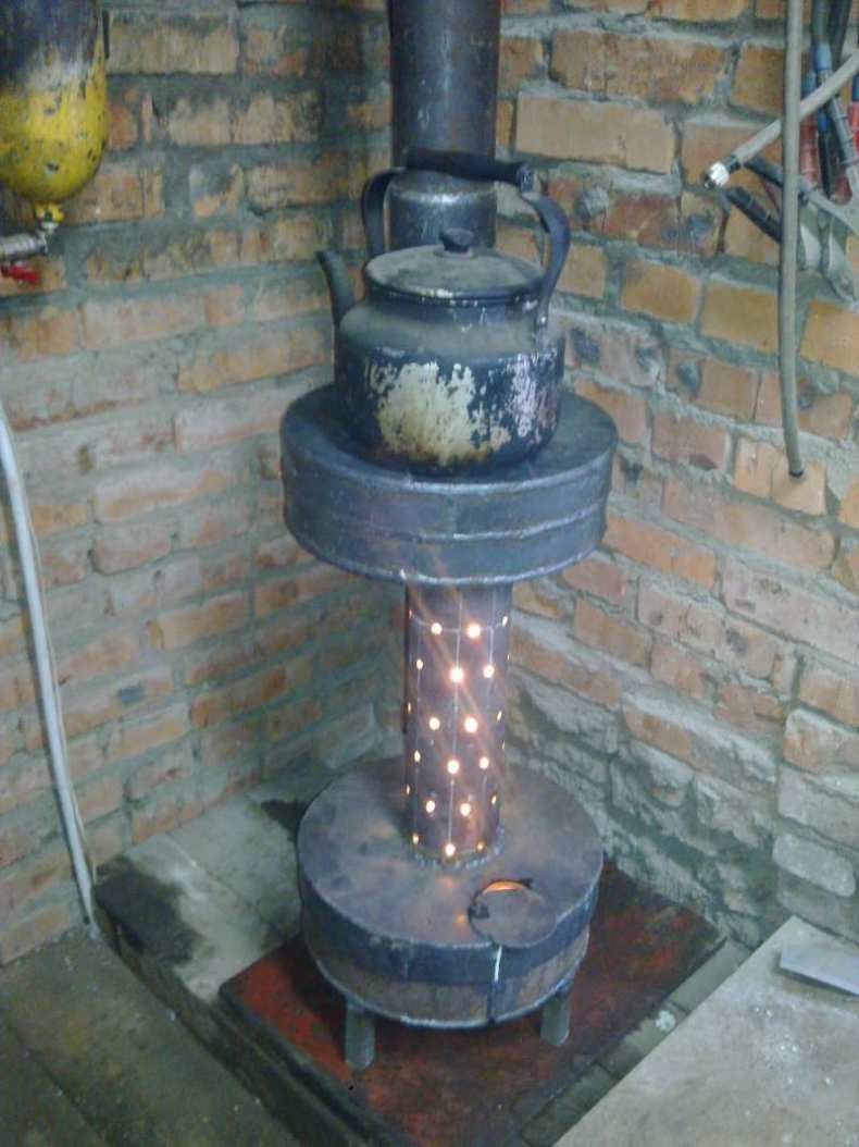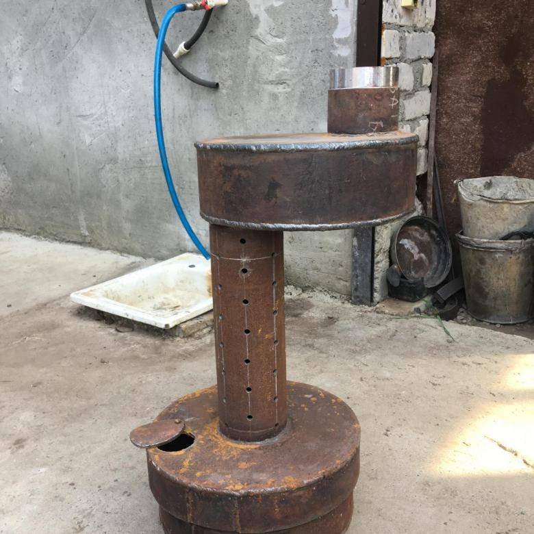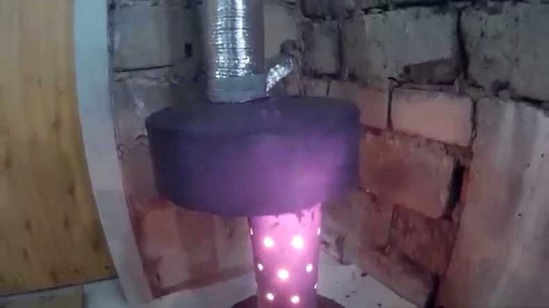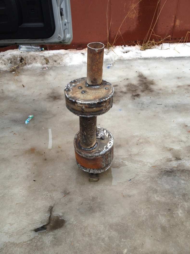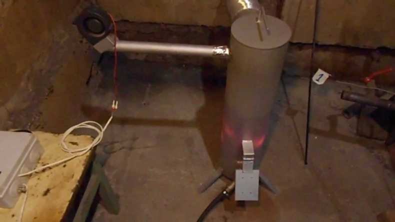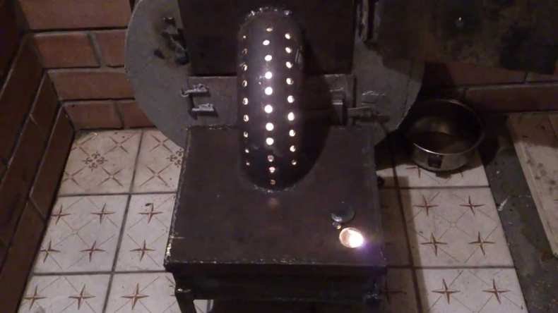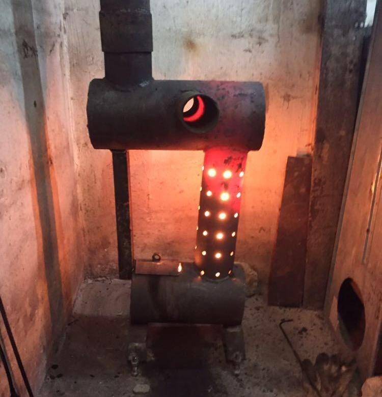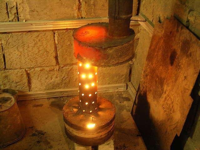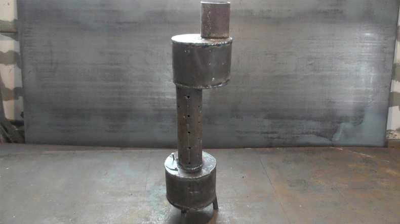 - Теперь можно залить в нижнюю емкость топливо и провести испытание — этот процесс лучше проводить на улице. Если он пройдет успешно, можно заносить печь в помещение и выводить дымоход на улицу.