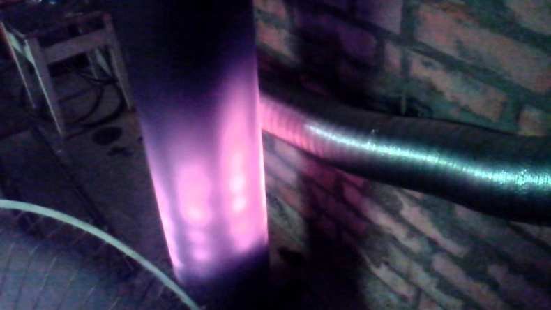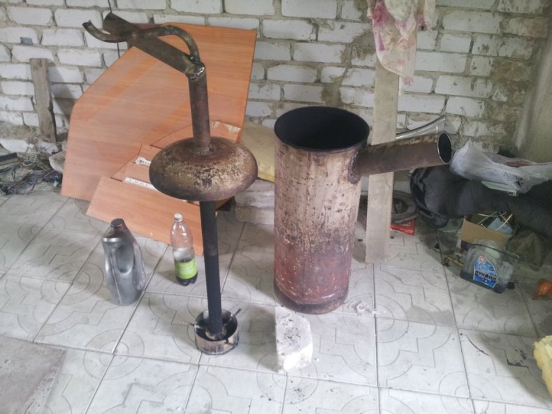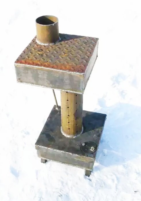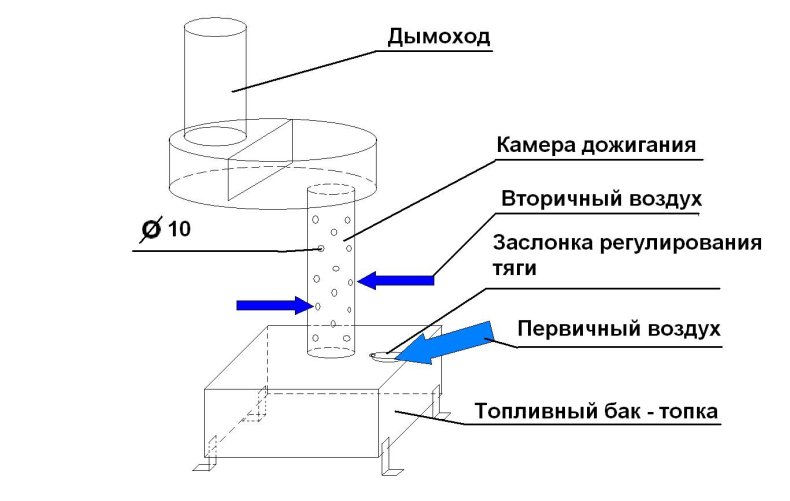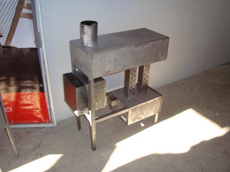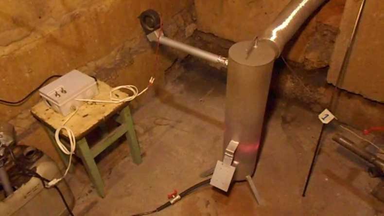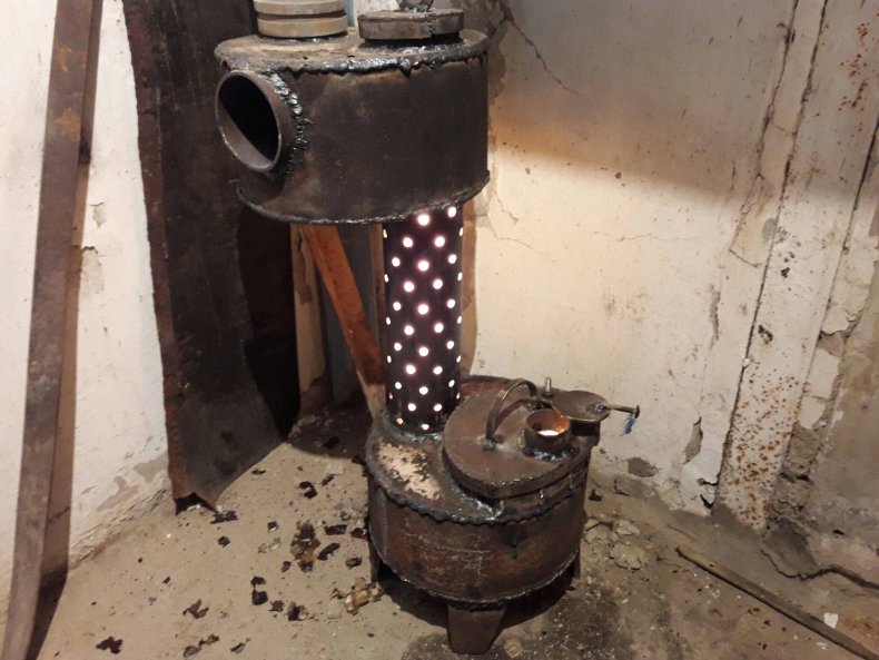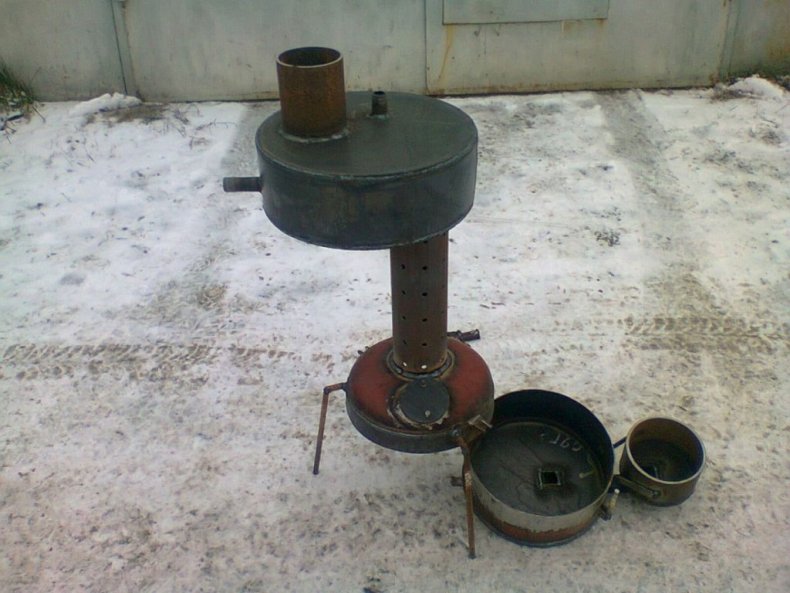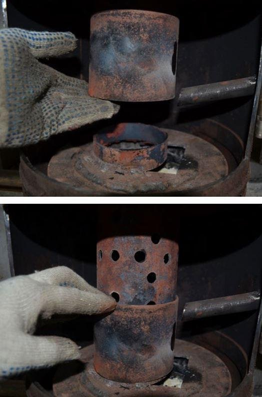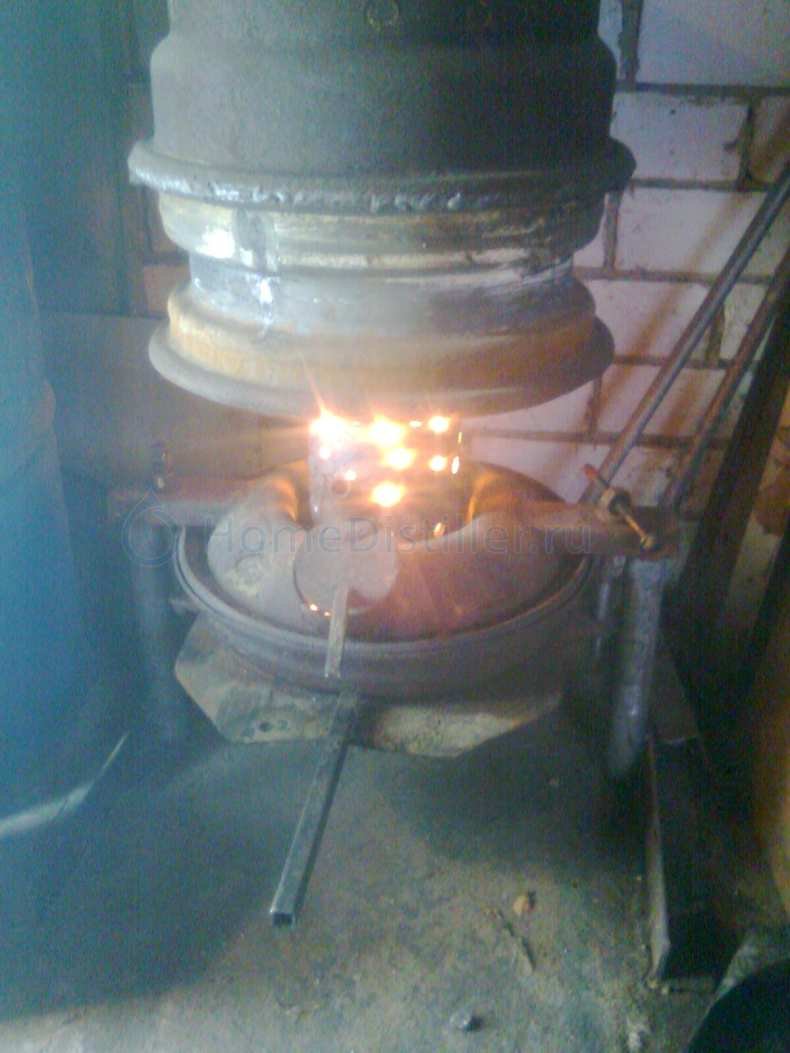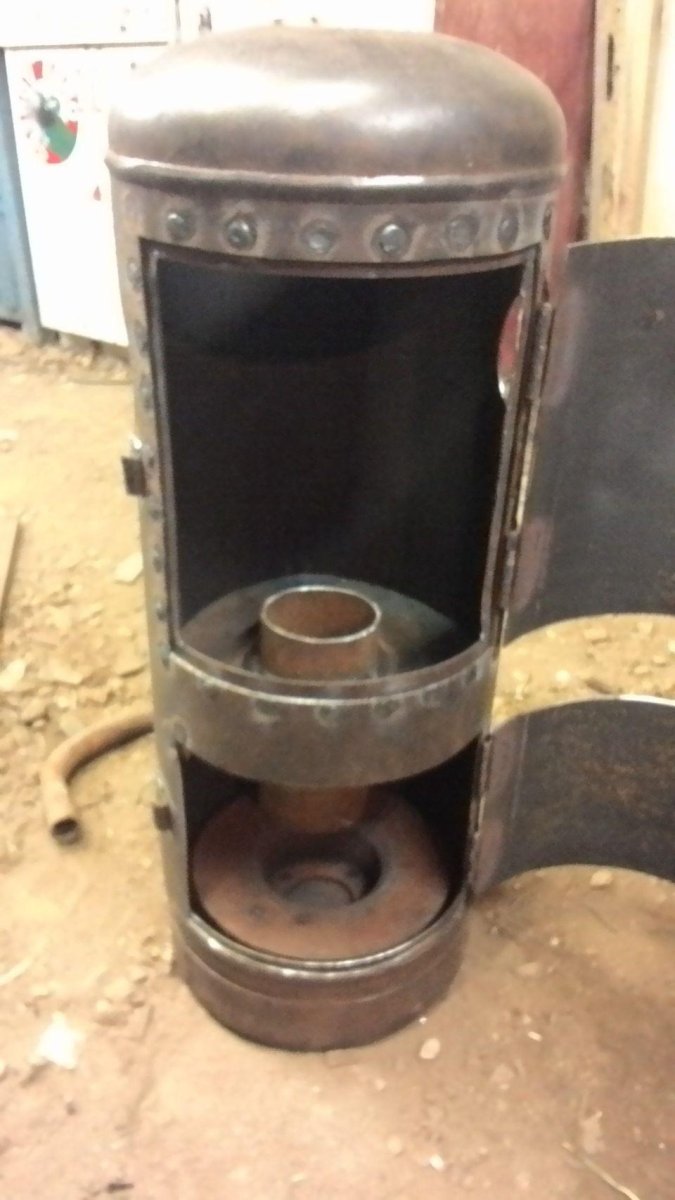 - Теперь можно залить в нижнюю емкость топливо и провести испытание — этот процесс лучше проводить на улице. Если он пройдет успешно, можно заносить печь в помещение и выводить дымоход на улицу.