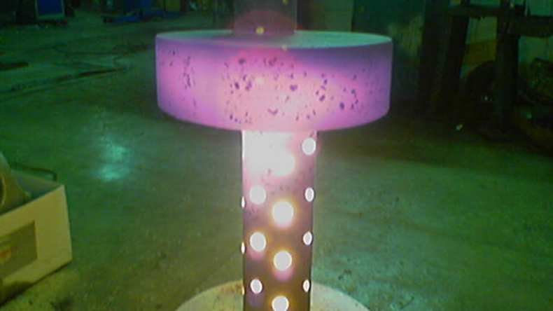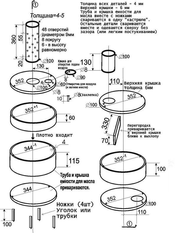 - Теперь возьмите отрезанную верхушку от баллона, вырежьте в ней отверстие диаметром 10 см, а также еще одно сборку диаметров 4 см. В меньшее отверстие следует вварить горловину с металлической крышкой, сюда будет вливаться отработанное масло.