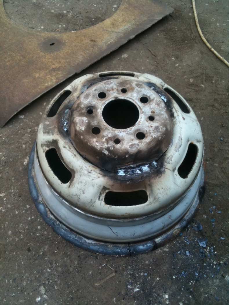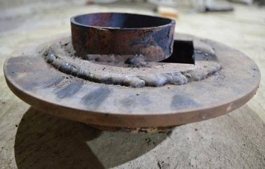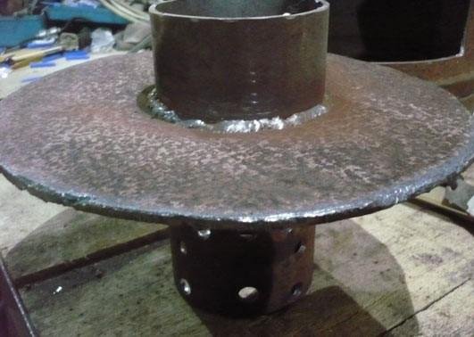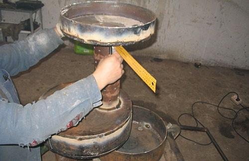 - Потом отрежьте от листового металла круг диаметров 14 см, после чего приврите его к отрезку трубы.