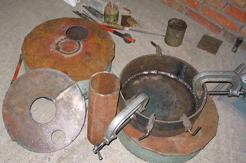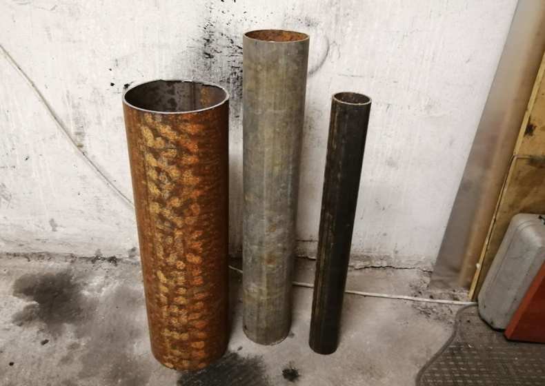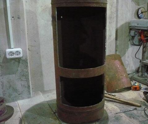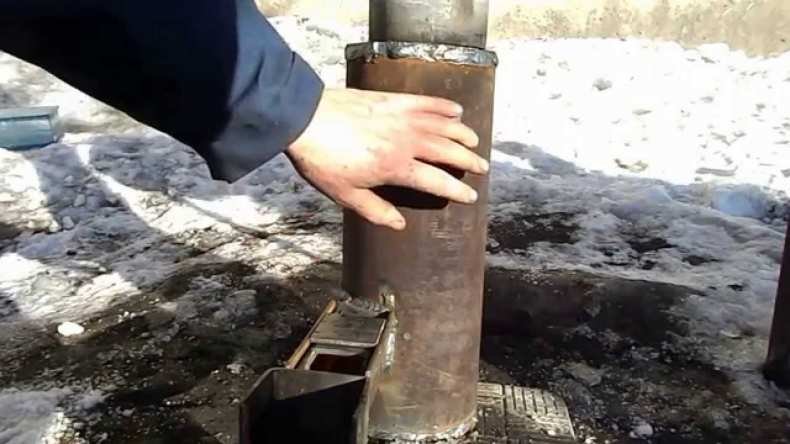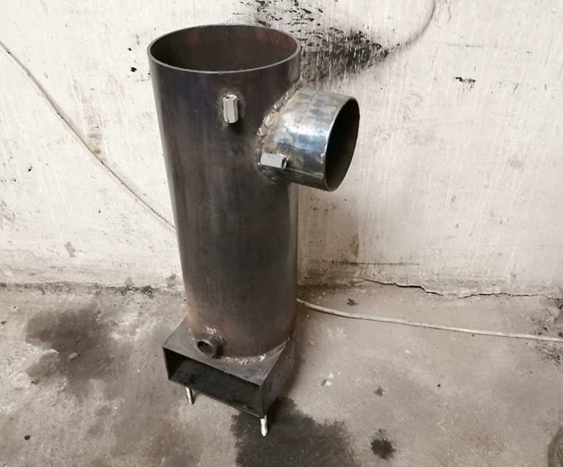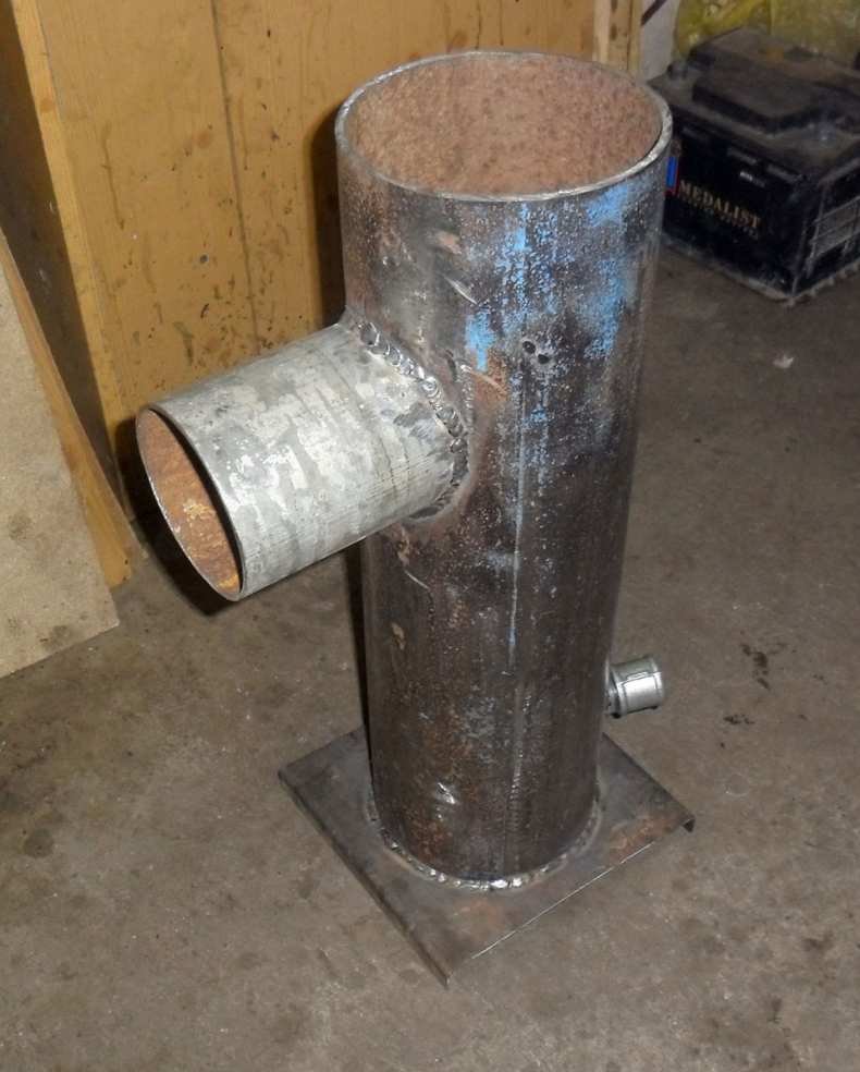 - Возьмите отрезок стальной трубы диаметров 8 см и длиной 70 см. Один конец трубы заварите куском листового металла.