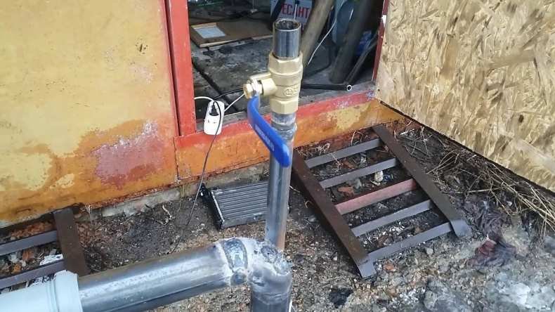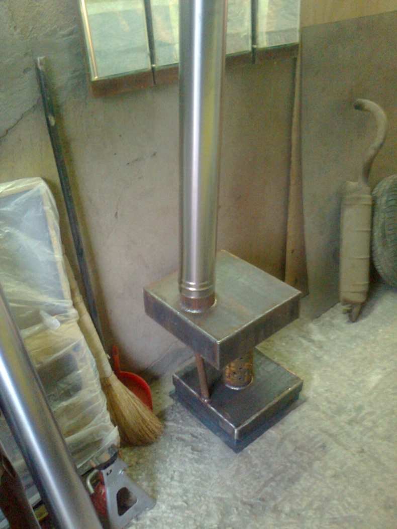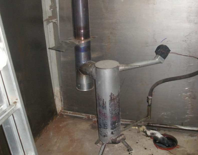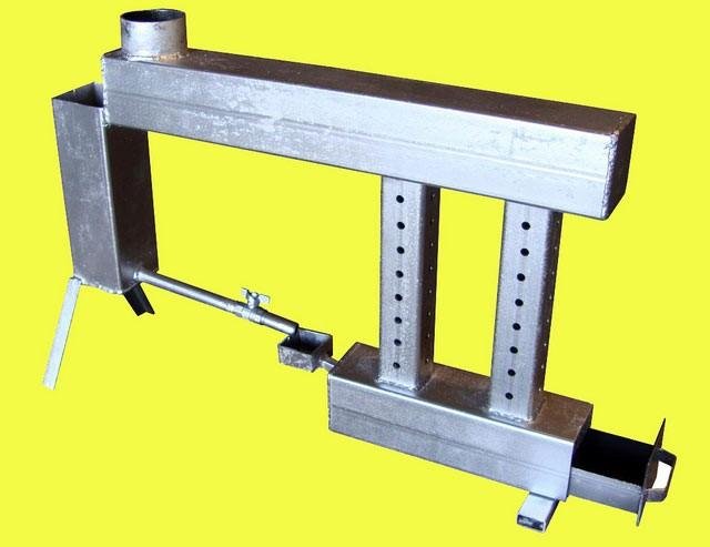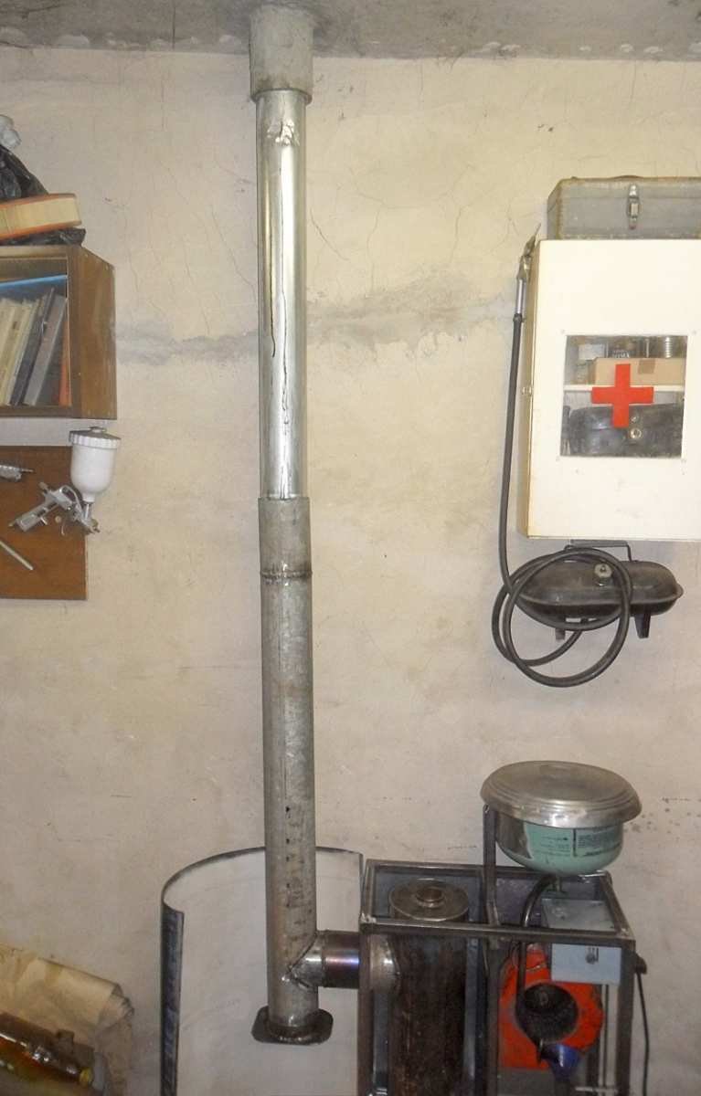 - После этого к горизонтальному участку трубы приваривается основной дымоход, длина которого должна быть не меньше 3,5 метров. Сначала нужно зафиксировать дымоход с помощью самодельных опор из уголков, а уже потом приваривать его к печи. В нижней части дымохода следует предусмотреть запирающую заслонку, это нужно для того, чтобы в дальнейшем было удобно его прочищать от скопившейся сажи.