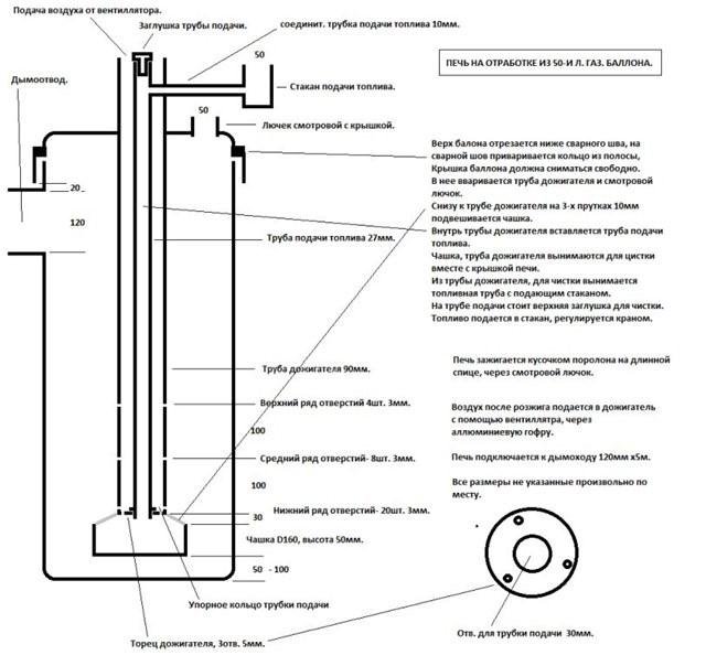 - От верхней точки баллона отступите 10 сантиметров, а затем при помощи сварки проделайте круглое отверстие по диаметру дымоотводного патрубка. Эта труба должна быть длиной 60 сантиметров.