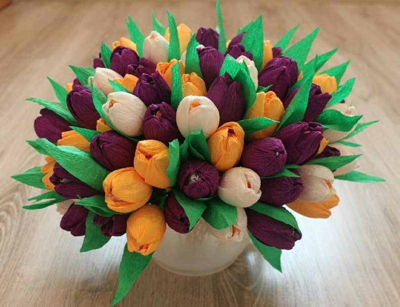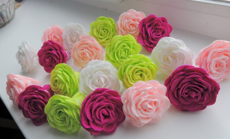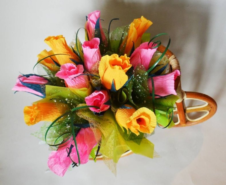 Для формирования цветов можно прибегнуть к разнообразным материалам: от обыкновенных салфеток до разноцветной гофрированной бумаги.