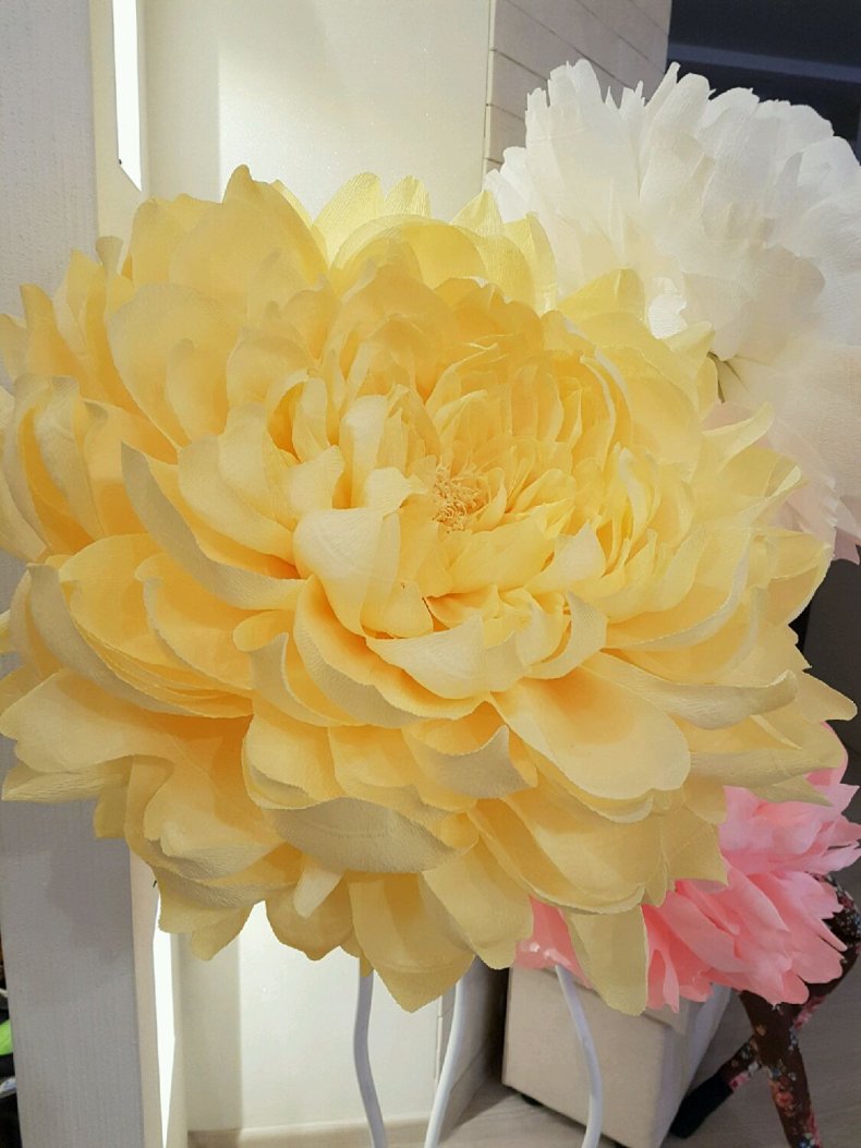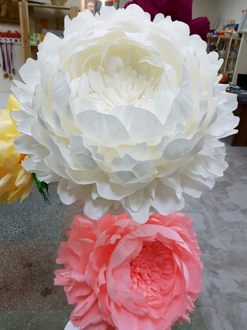 Рассмотрим пример создания больших цветов из подручных материалов. Идея появилась после работы с бумагой тишью. Она представляет собой тонкую, бумагу для упаковок с широкой палитрой цветов.