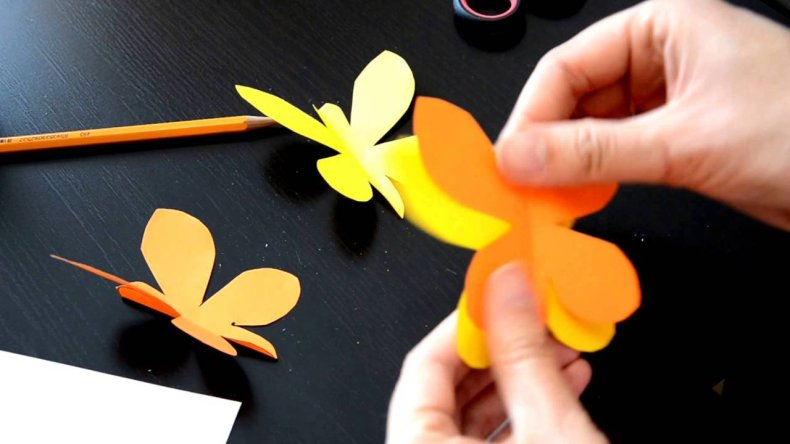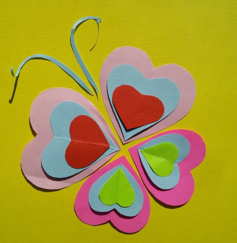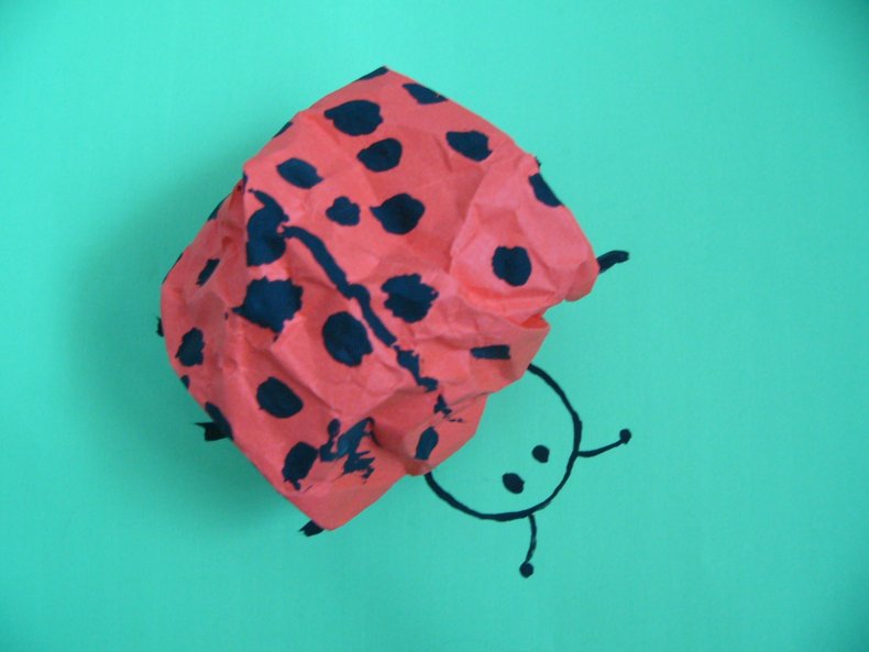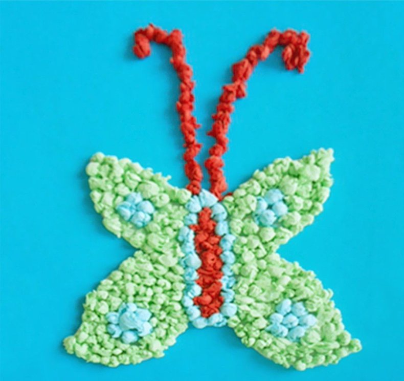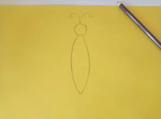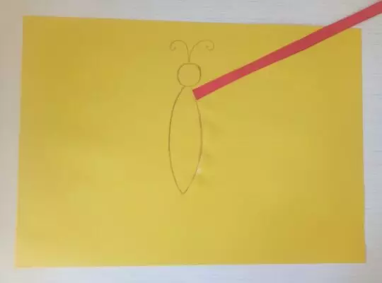 Как крылья будут сформированы, нужно приклеить между ними тело, а затем пририсовать усики. Чем-то светлым можно нарисовать глаза и ротик на голове.