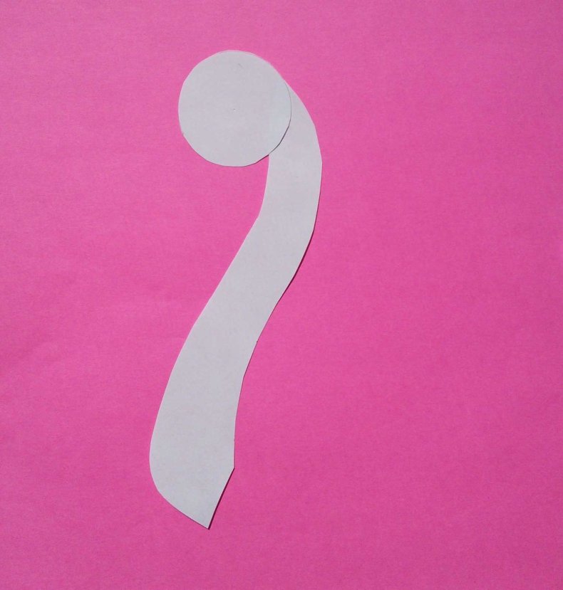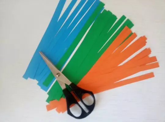 - Все приклеивается на голубую часть, кроме головы. После этого нужно нарезать из цветной бумаги несколько длинных полосок разных оттенков;