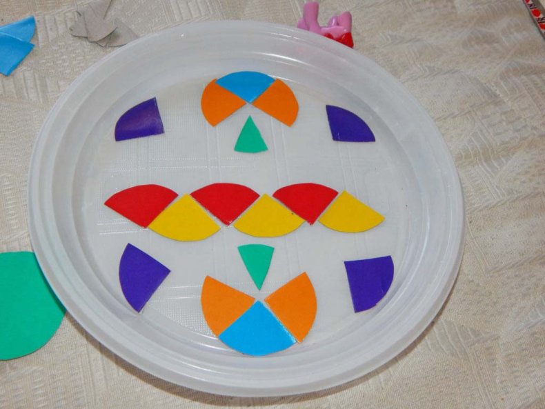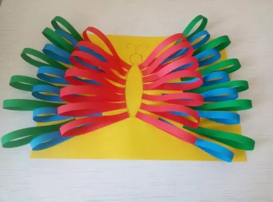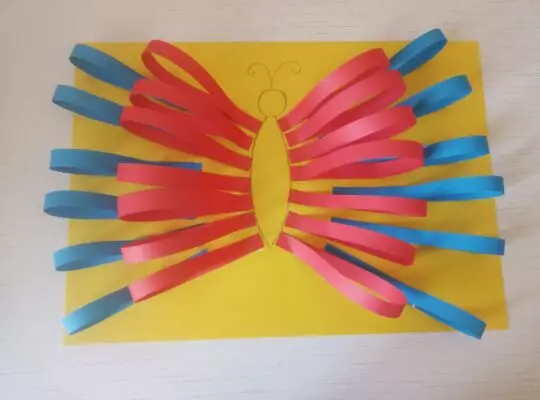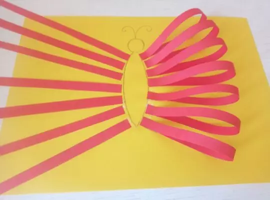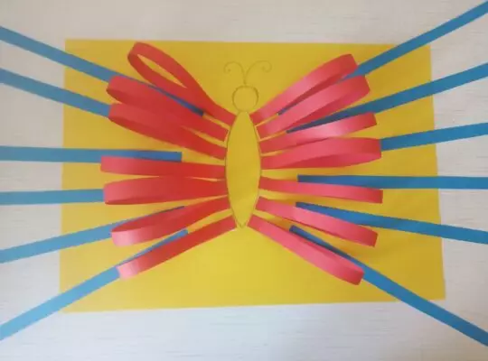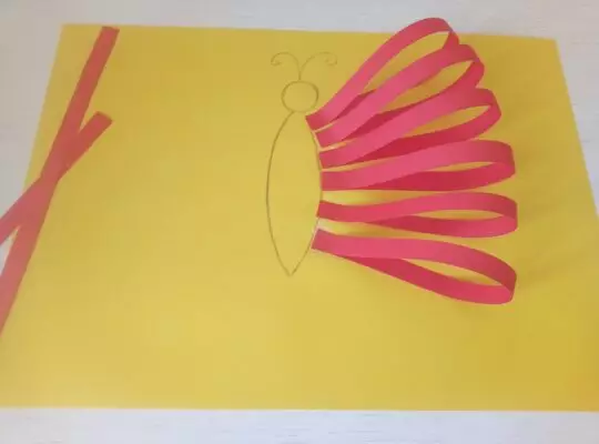 - После этого, вплотную друг к другу, наклеиваются полоски-капли, оставляется немного места для туловища и по обе стороны от него чередуются цвета, от меньшего количества к большему. Наклеить это нужно таким образом, чтобы получились крылья;