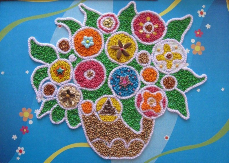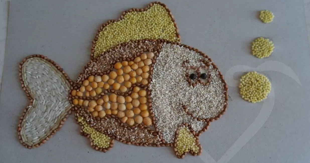 Очень интересный и полезный для развития пальчиков вариант – это аппликация из крупы. С помощью нее можно украшать любую поделку. Обычно за основу берется какой-то трафарет, а потом он заполняется самой разной крупой.
