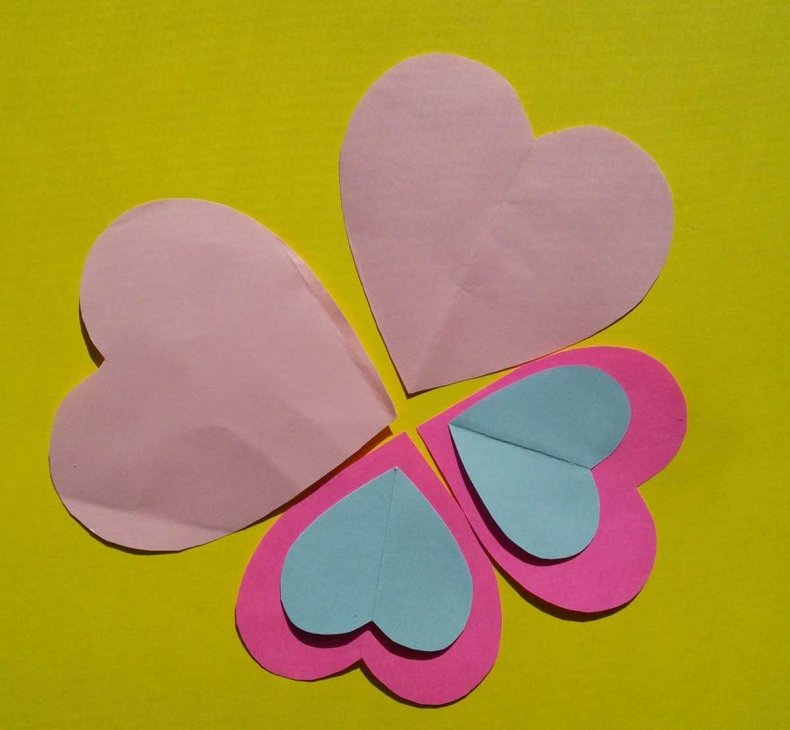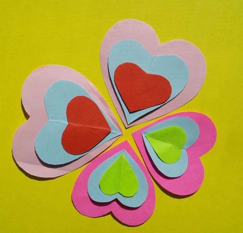- Дальше понадобится вырезать много сердечек одинакового размера из цветной бумаги, можно подготовить предварительно трафарет, обвести его и вырезать заготовки;