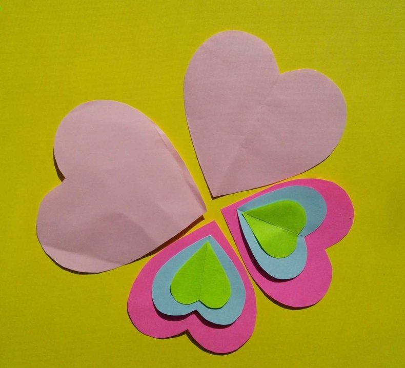 - Дальше вокруг мордочки приклеиваются сердечки, клей наносится на острую часть и на заднюю сторону, чередуя цвета, клеятся вырезанные заготовки.