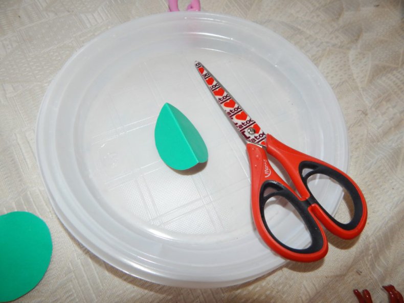 - Сверху фрукта нужно пририсовать веточку, а к ней приклеить листочек из зеленой бумаги, который был предварительно вырезан. Поделка закончена и может занимать положенное ей место.