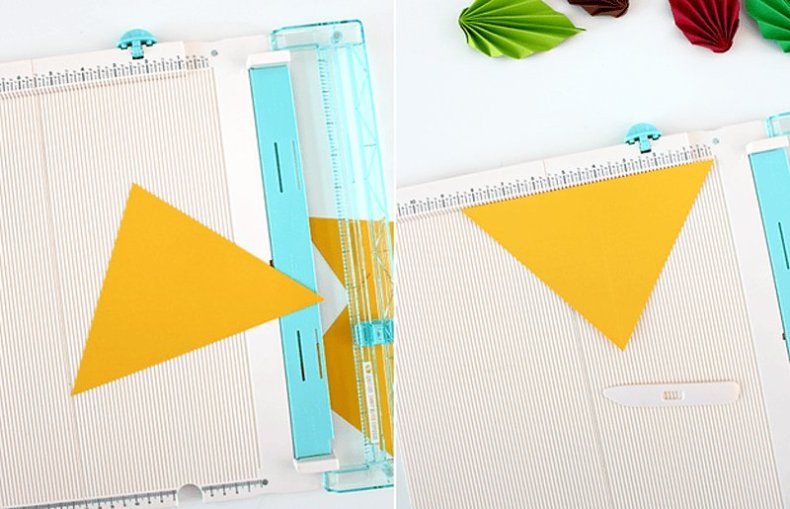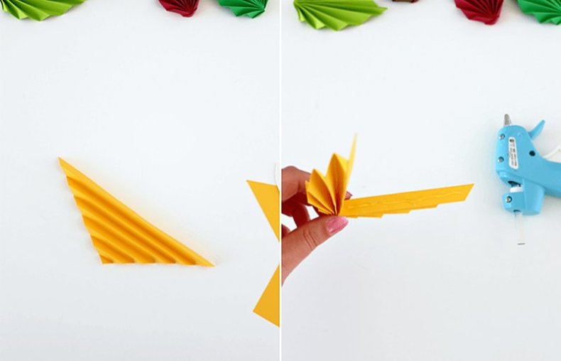 Разные цвета гармошек вставляются друг в друга, стороны каждого элемента проклеиваются между собой, чтобы сформировать единый разноцветный веер.