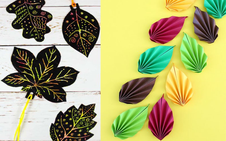Замечательные листья получатся из бумаги, сложенной гармошкой. Можно использовать любые цвета (красные, зеленые, желтые, оранжевые).