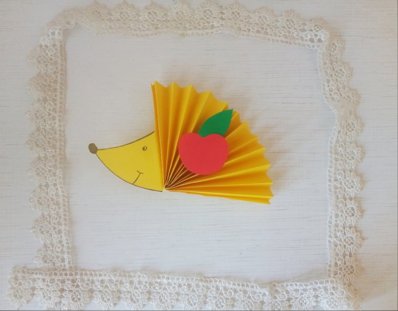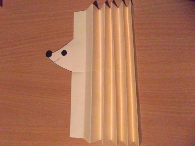 Полученную треугольную гармошку приклеивают к белому кругу (вершина треугольника должна упираться в голову ежика). Изделие готово! Можно дорисовать на белом круге носик и глазки животному.