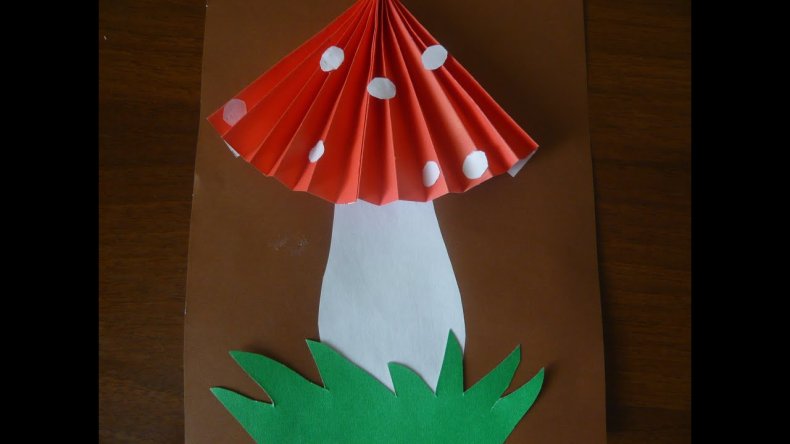 - Из белой бумаги вырезается крупный овал (ножка гриба), к которому приставляется красная гофрированная шапка.