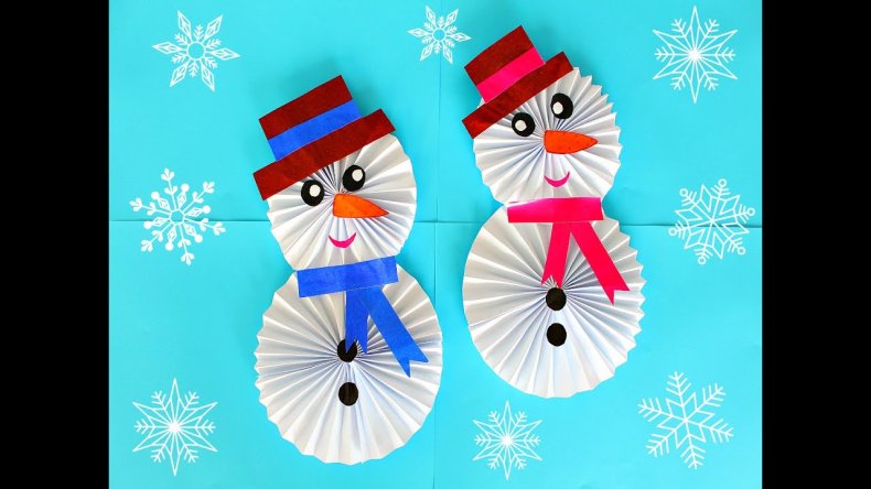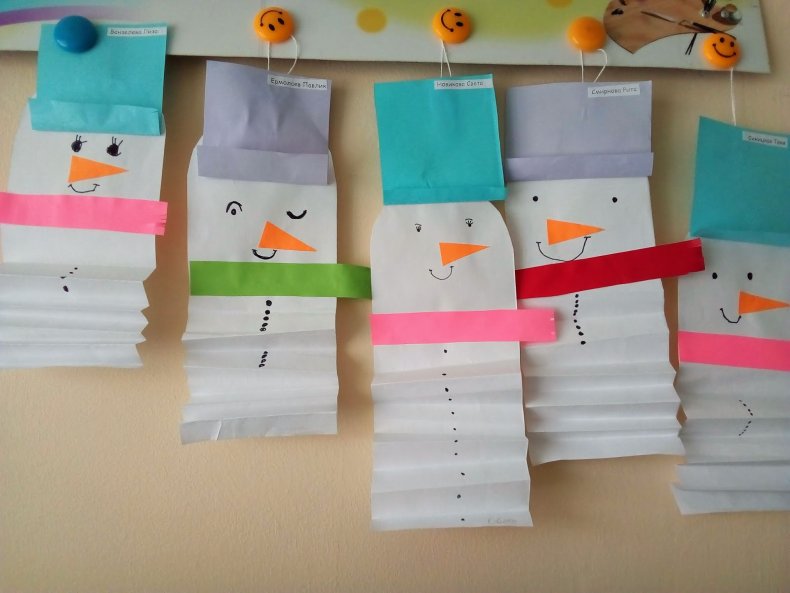 Рельефный снеговичок легко получается из обычной белой бумаги. Прямоугольники должны быть разной величины (от большего к меньшему).