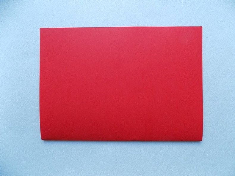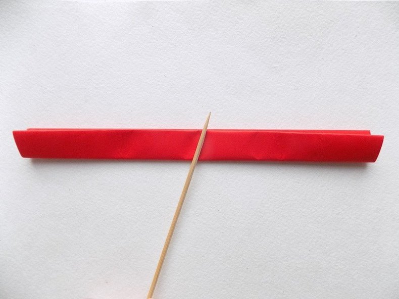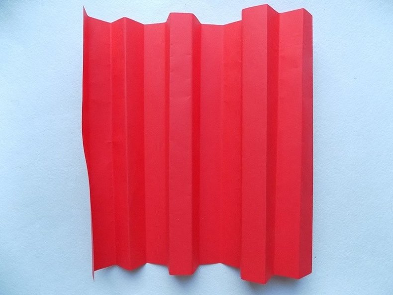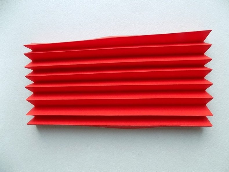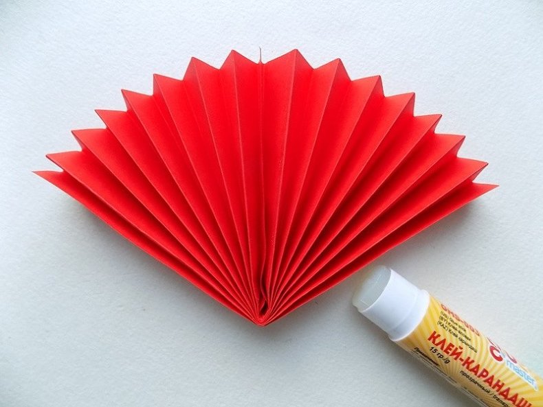 - Из красной бумаги вырезается прямоугольник, складывается гармошкой, сворачивается пополам и склеивается между собой для создания веера.