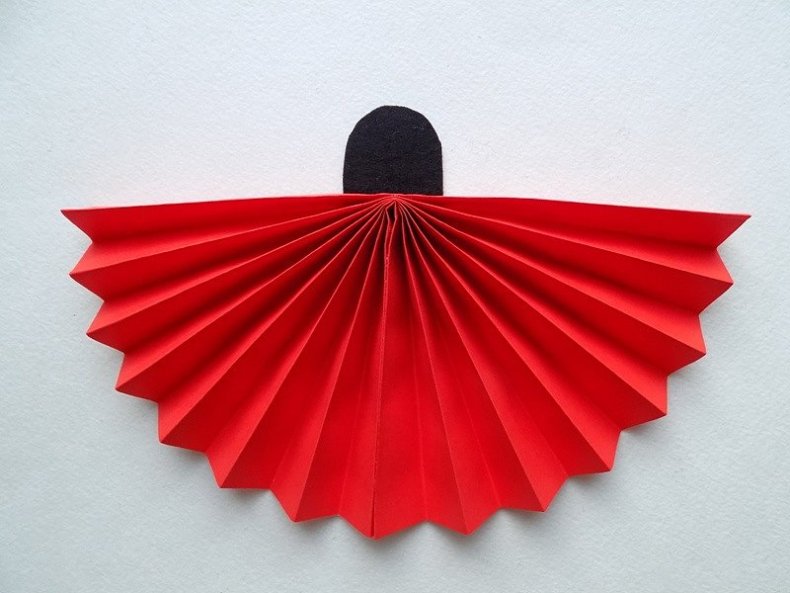 Божья коровка создается по аналогии с поделкой “Ежик” и “Мухомор”. Веер формируется из красной бумаги, складывается пополам, стороны проклеиваются по центру.