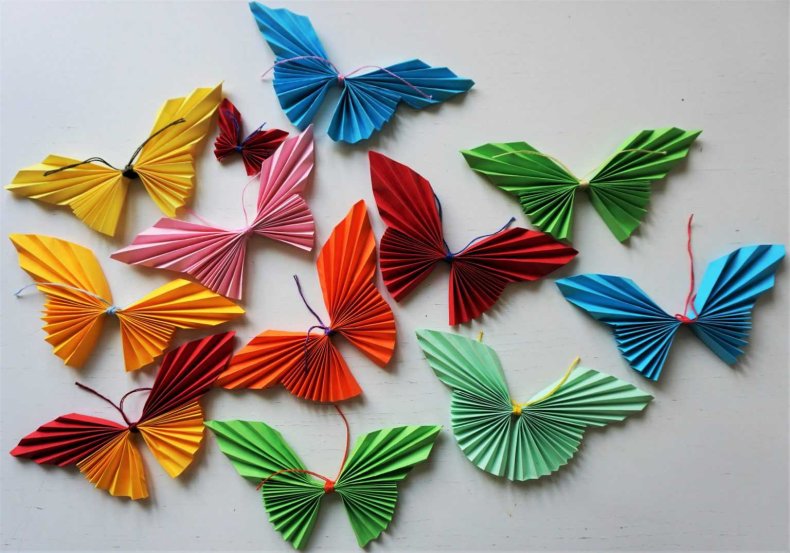 Во время складывания бумаги важно тщательно проходить линии сгиба пальцем, чтобы гармошка получилась рельефной. В центр готовой бабочки вклеивается туловище с усиками, которые можно вырезать из картона.