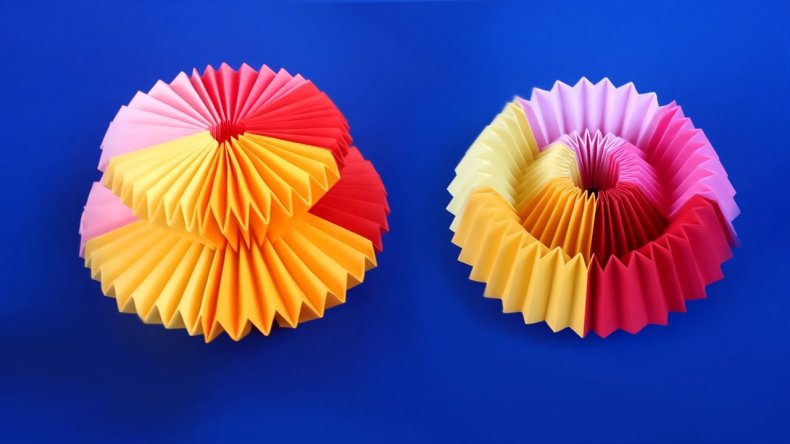 - Каждый прямоугольник складывается гармошкой, перегибается посередине, крайние части проклеиваются так, чтобы получился ровный круг (клей наносится на полосы с обоих краев веера).