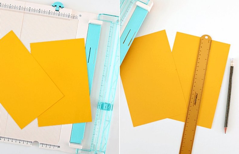 - Из желтой бумаги нарезаются 2 прямоугольника, которые складываются гармошкой.