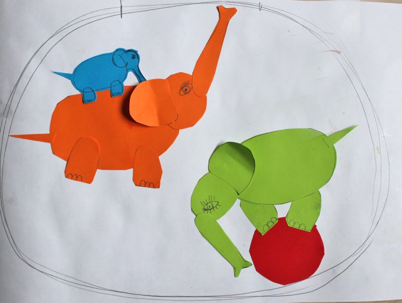 - Поставить лапы слона, к нему приклеить квадрат, после чего уши и голову.