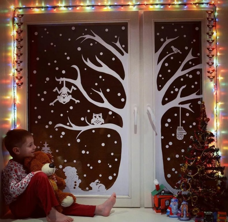 - Сверху на него губкой нанести витражные краски, зубную пасту или воспользоваться «жидким снегом».