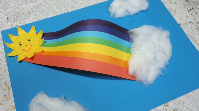 - Вырезать полоски красного, оранжевого, желтого, зеленого, голубого, синего и фиолетового цвета, прикрепить их к небу.