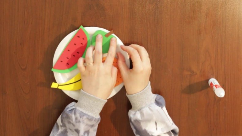 - Обклеить ими одноразовую картонную тарелку, чтобы она была полностью разноцветной.