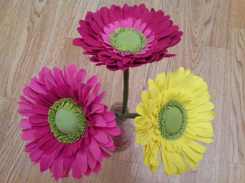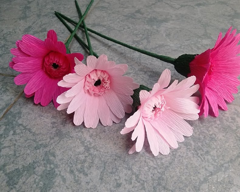 Герберы – это очень красивые и пышные цветы, которые превосходно смотрятся даже изготовленными из бумаги. Для такого цветка нам потребуется любого цвета гофрированная бумага.