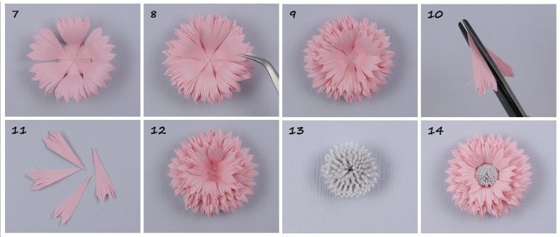 - Далее поочередно начинаем приклеивать лепестки, оборачивая ими шарик – центр цветка.