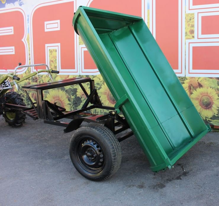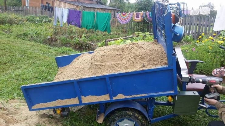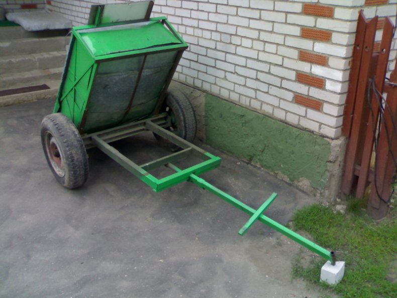 - Удобным устройством обладает и самосвал. Его конструкция почти сопоставима с обычными прицепами, но имеет усовершенствованную функцию разгрузки груза, с помощью откидывания ящика. Данная модель потребует больше материалов, но это того стоит.