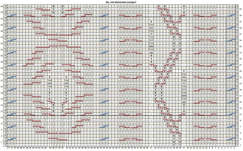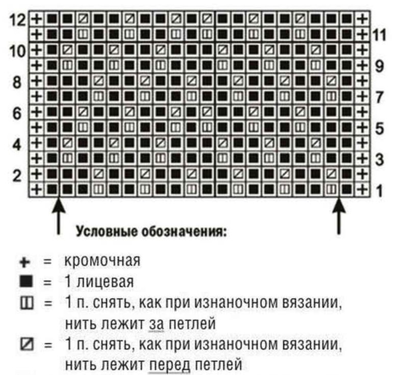 Наберите несколько горизонтальных раппортов и вяжите по схеме: