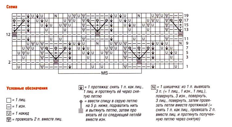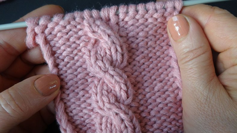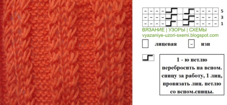 - 5: 3 изнаночных, 1 петлю с дополнительной спицы перед работой провяжите после 2 изнаночных петель, находящихся в предыдущем ряду, 2 лицевые, 1 изнаночная, снимите с дополнительной спицы 1 лицевую петлю, 1 лицевая петля.