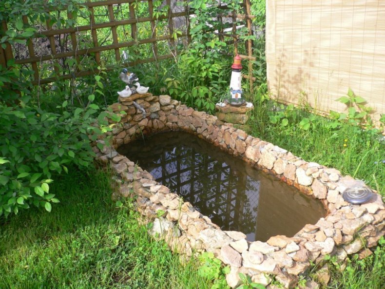 - Чтобы водоем не начал цвести, установите на дно ящик с древесным углем, ящик при этом должен пропускать воду.