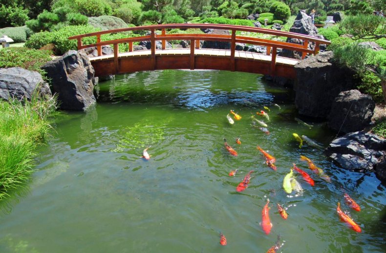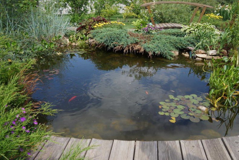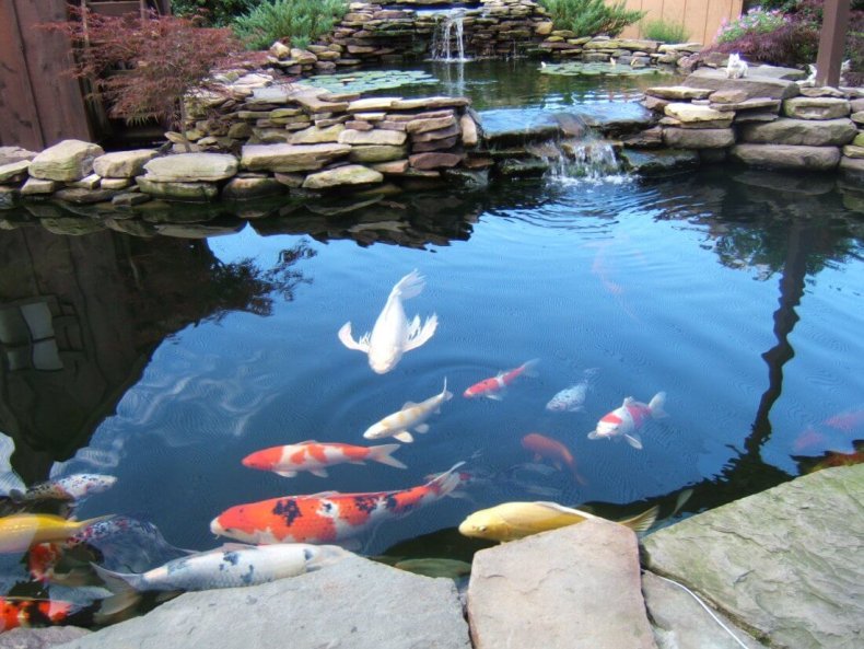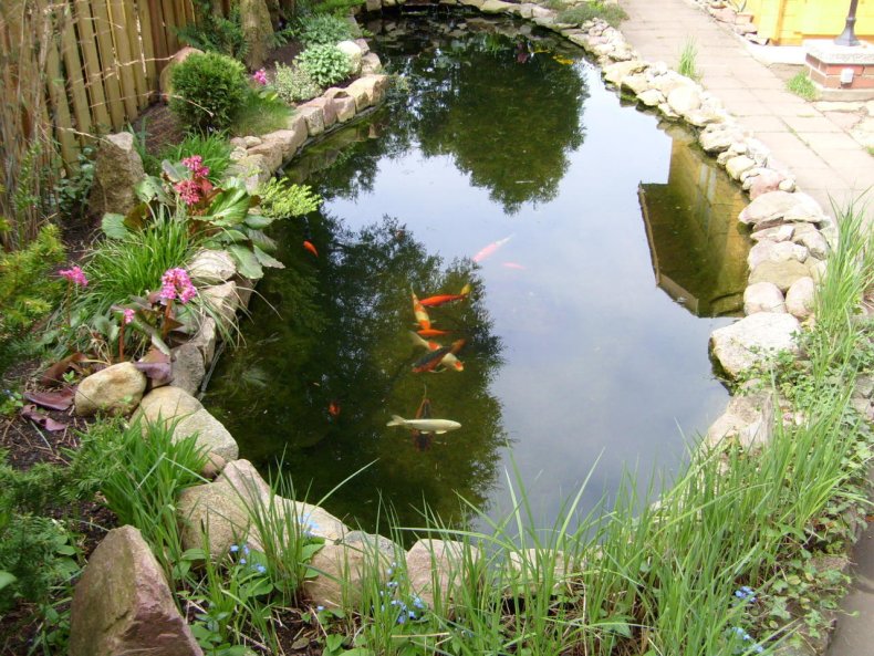 - Пруд с рыбами. Пруд можно сделать любой формы, разводить вы можете как декоративных рыб, так и распространенные виды для рыбалки. Главная особенность создания этого пруда – обеспечить хорошую фильтрацию и аэрацию воды.