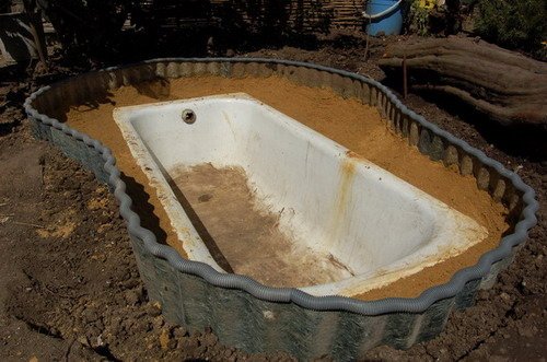 - Теперь нужно потихоньку начать заполнять емкость, попутно следует заполнять зазор между котлованом песком. Трамбовать песок нужно строго до уровня формы, далее можно приступить к декорированию пруда, для этой цели подойдет любая растительность или красивые камни.